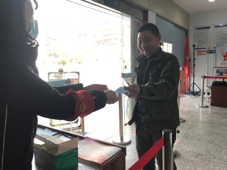“請(qǐng)留步稍等!我們這邊將自己的備用口罩,送您一只!疫情還未結(jié)束,防疫不能放松。下次進(jìn)大廳請(qǐng)您記得一定要佩戴口罩!”