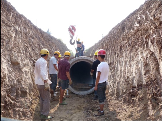 施工人員正在溝槽進(jìn)行DN1200管道吊裝