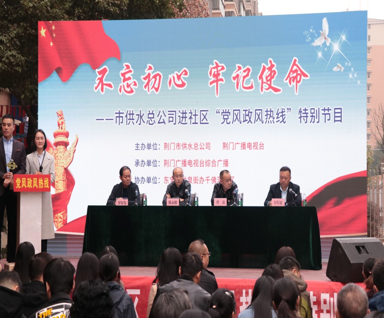 11 6日上午,由荊門市供水總公司和荊門廣播電視臺聯(lián)合舉辦的“荊門供水進社區(qū)‘黨風(fēng)政風(fēng)熱線’特別節(jié)目”在荊門千佛洞社區(qū)舉行。市供水總公司黨委書記、總經(jīng)理陳永根帶領(lǐng)領(lǐng)導(dǎo)班子相關(guān)成員參加節(jié)目現(xiàn)場(網(wǎng)絡(luò))直播,圍繞“不忘初心、牢記使命”主題教育,傾聽民情民意,接受現(xiàn)場問政,回應(yīng)百姓訴求,解決用戶難題。
