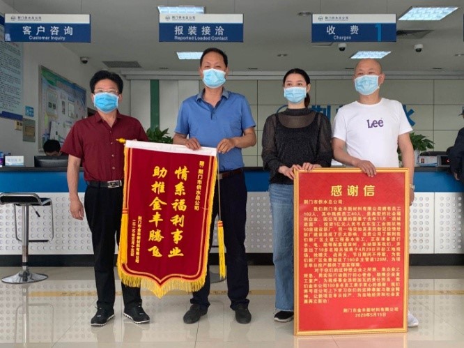 5月15日上午,荊門市金豐新材料有限公司總經理袁家群和東寶區(qū)工商聯相關負責人來到市供水總公司,送上感謝信和寫有“情系福利事業(yè) 助推金豐騰飛”的鮮艷錦旗,以感謝市供水總公司想企業(yè)之所想、急企業(yè)之所急,用實際行動踐行初心使命,助推企業(yè)復工復產。